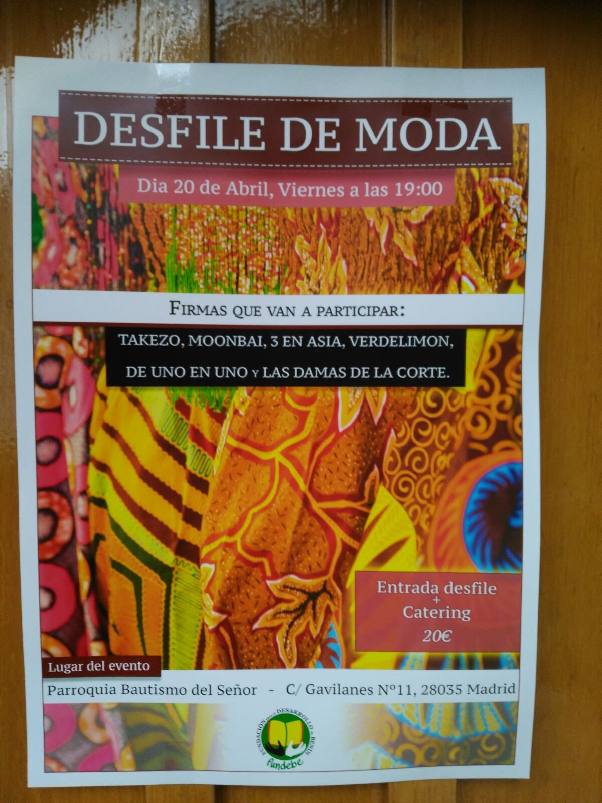 Ya ha llegado el segundo desfile de moda organizado por FUNDEBE (Fundación para el desarrollo en Benín). Tendrá lugar el viernes 20 de abril a las 19:00 en los salones de la parroquia. La entrada cuesta 20 euros incluyendo el catering. Todo el dinero recaudado irá destinado a FUNDEBE.